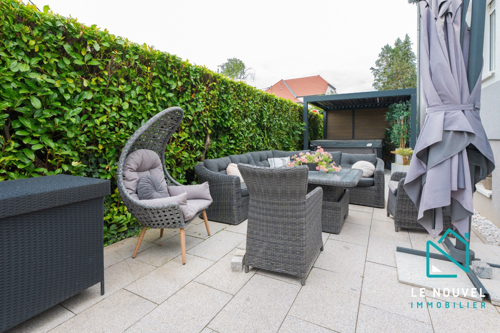Cette terrasse en L vous offre un premier espace idéal pour un "coin repas", un second accueille le salon de jardin et le jaccuzzi.